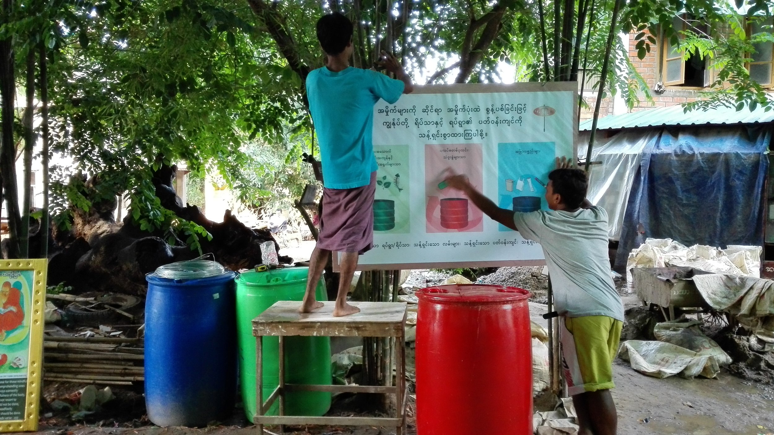 There were about seven volunteers at the time, seeing that the country was still in its early days of ‘democracy’, and the first to join was a local Burmese layperson, we now call Auntie Mya Mya, whom I was lodging with. We needed to create banners to put besides the barrels, so a Spanish graphic designer, Gil Serrat, was the next volunteer to design the vector icons of waste categories. Then a Burmese nun translated the text we had written and added it to the graphics.